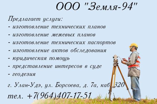 Юридические услуги ООО "Земля - 94" город Улан-Удэ Предоставляем услуги: • Изготовление технических планов • Изготовление межевых планов • Изготовление технических паспортов • Изготовление актов обследования • Юридическая помощь в оформл...